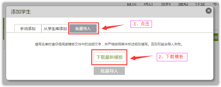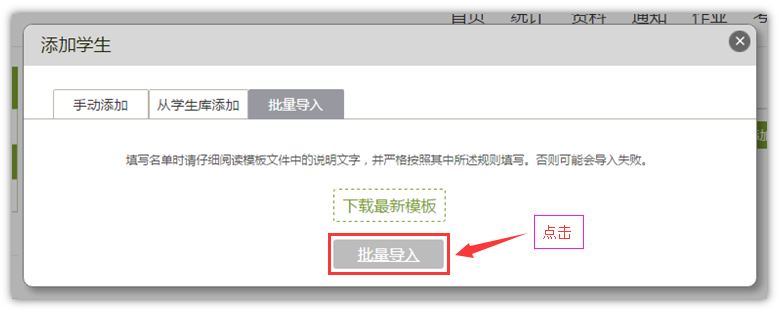 点击“批量导入”,并下载学生导入模板。