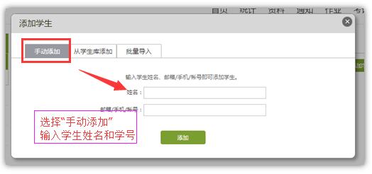 方法1:选择手动添加,并输入学生姓名和学号,完成后点击“添加”。