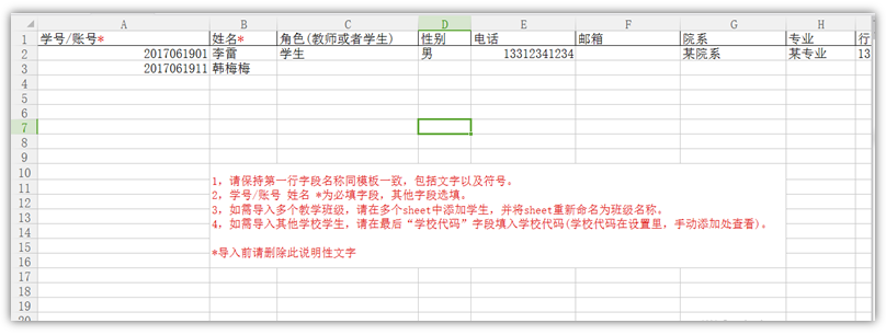下载模板,根据要求录入学生信息。