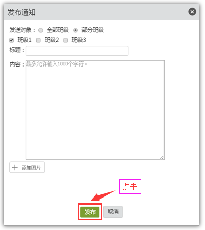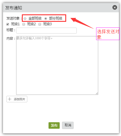 第3步:选择发送对象,并输入通知标题和内容,可添加图片。