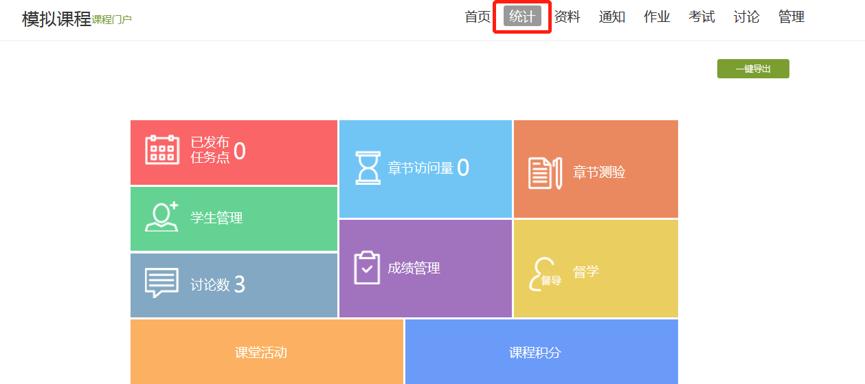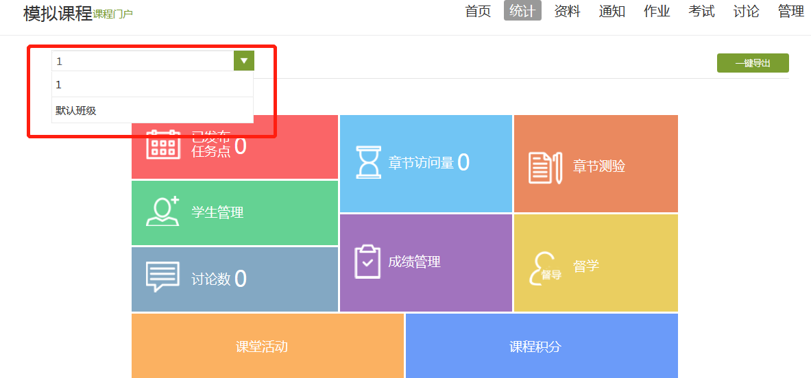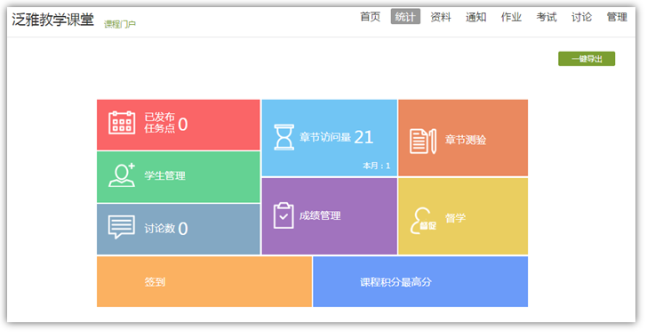 在统计界面,下拉列表,则可以查看班级的总的任务进度信息和学生综合成绩及学习情况等信息,点击上方“一键导出”,即可以 EXCEL 表格模式导出成绩详情等各类信息。