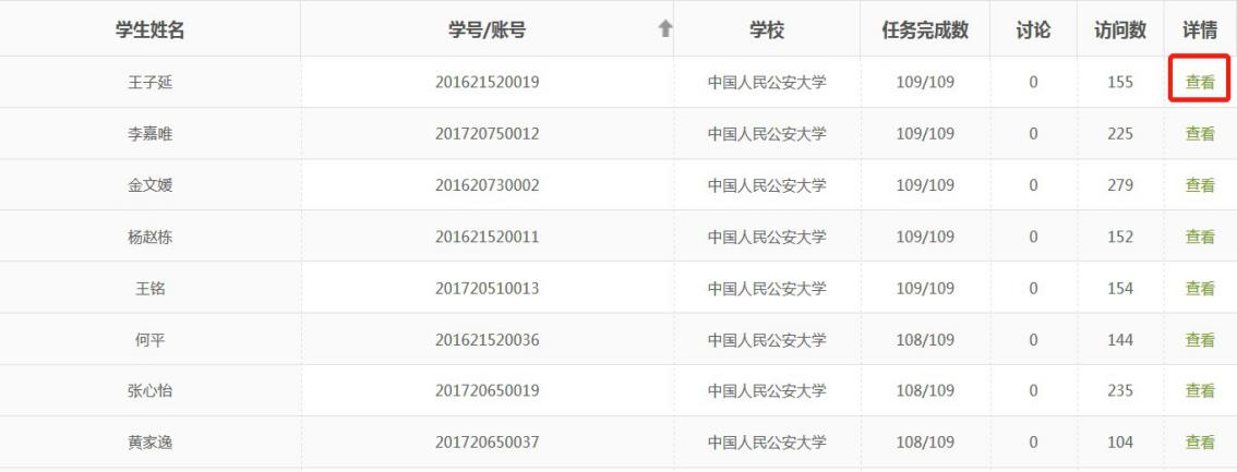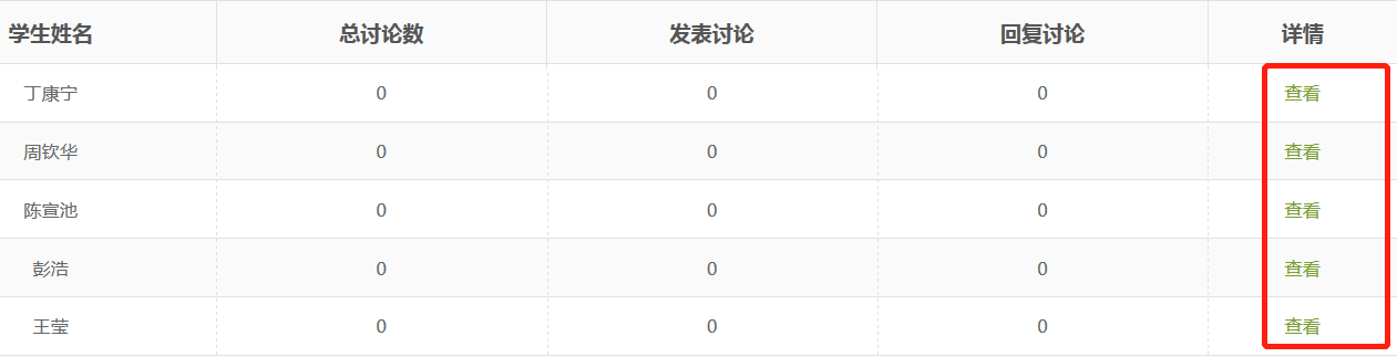 包括总讨论数,回复讨论数,置顶讨论数,讨论总分等情况都被罗列出来。单击右侧查看按钮即可查看该名学生的具体讨论情况。