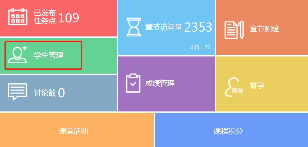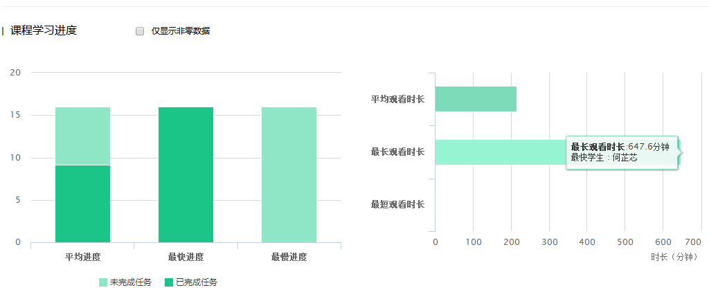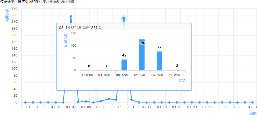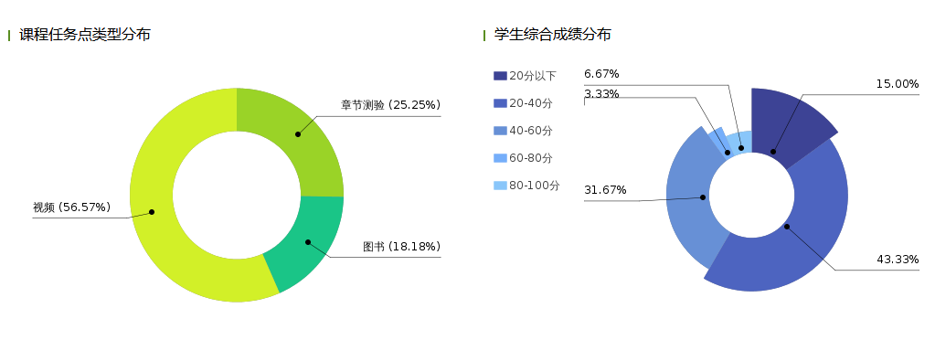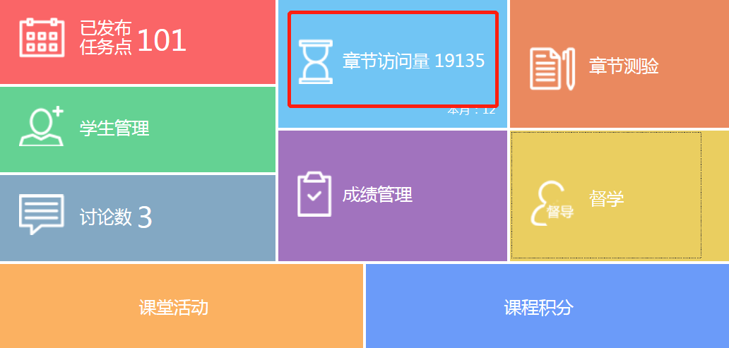 平台可以详细的统计出本门课程的所有章节数,包括在这门课程中间所包含的任务点数,作业数,视频数等,方便老师对整个课程有一个宏观的了解。同时, 老师还可以统计出在最近的一段时间同学们的活跃程度,一方面可以对同学们的学习情况有一个整体的了解,另一方面也在客观上督促了同学们的学习。