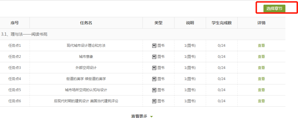 测验的完成详情和视频的观看情况都可以通过点击任务点右侧的“查看”按钮进行查看。并且选择章节
