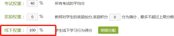 权重设置要加起来为 100%,如果老师不想用权重作为学生的总成绩。那么直接设置线下权重为100%
