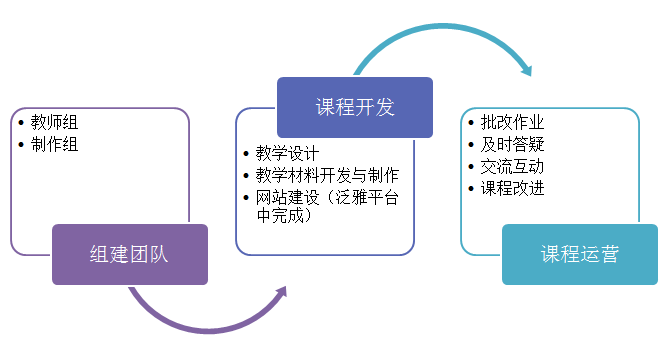 课程开发需要整个团队的协作,由课程负责人负责全盘指导,团队成员分工明确。课程开发完成后需要进行测试。(使用泛雅平台可以免去软件测试环节,可选少量学生作为样本,尝试学习)