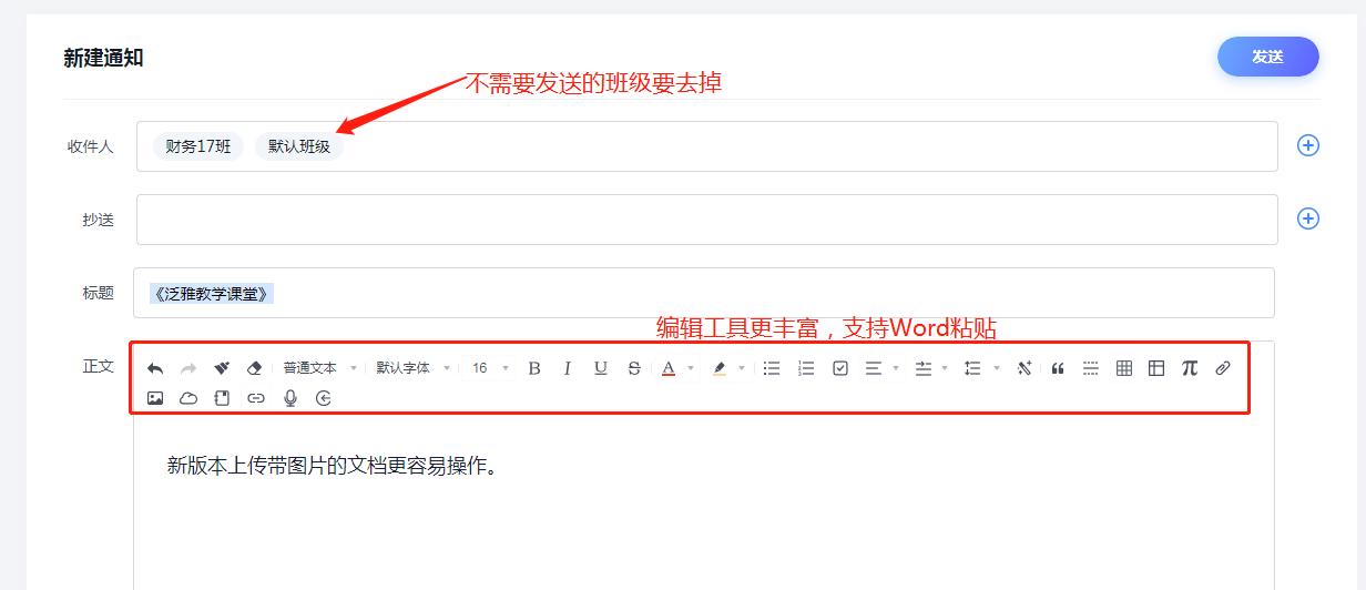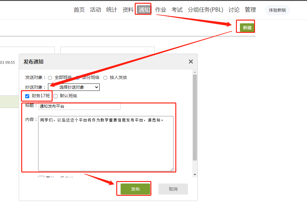 尝试发送第一个通知,告诉同学们以后消息都在这里通知。