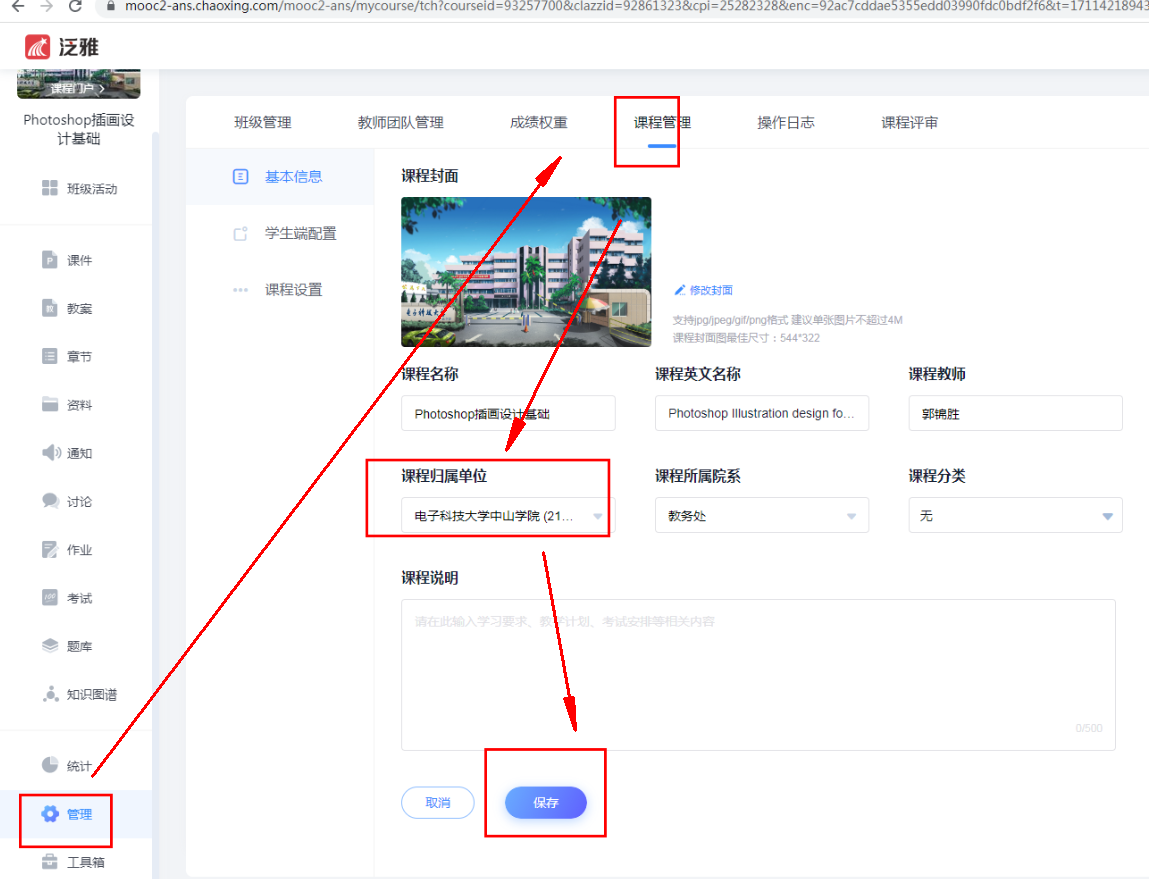 打开课程,点击 “管理”,打开课程管理,点击“编辑”,将课程归属单位改为“电子科技大学中山学院(2182)”,点击保存即可