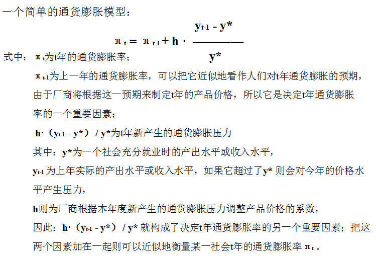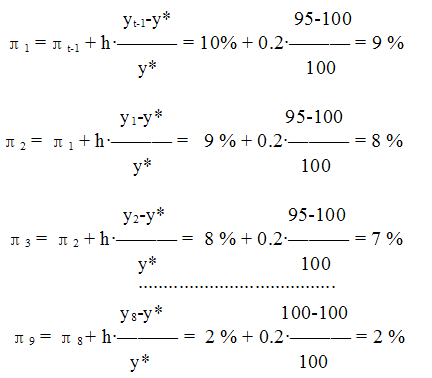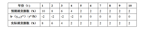 例:设初始状态存在着10%的通货膨胀率,而该社会充分就业的产出水平或收入水平为100个货币单位。又假设政府想把通货膨胀率从10%降低到2%。为了达到这一政策目的,政府可以通过紧缩性的经济政策把实际产出水平或收入水平降至低于充分就业的水平,譬如把它维持在95个货币单位的水平,一直到通货膨胀率下降到2% 时为止。又假定上述公式中的价格调整系数h = 0.2。则政府实行紧缩政策后的第1年,通货膨胀率为: