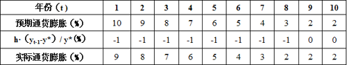 如果政府不采用渐近主义的方法,而是实施力度较大的紧缩政策,譬如把实际产出水平或收入水平压低到90个货币单位,那么,通货膨胀的调整过程将大大缩短。西方国家通常把这种方式称为“冷火鸡”式的调整。如果把产出水平或收入水平一下子压低到90个货币单位,而其它的假设条件和上例相同,则得出的计算结果如下表: