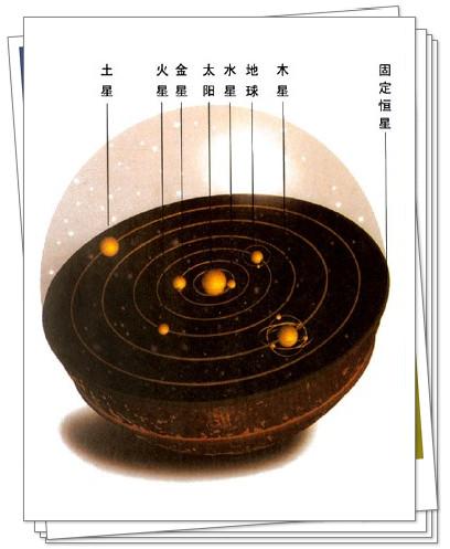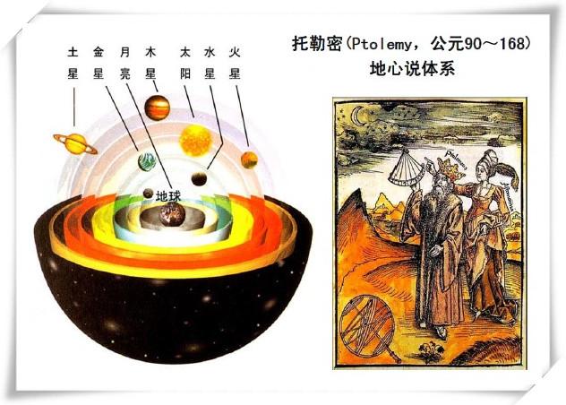 托勒密于公元二世纪,提出了自己的宇宙结构学说,即“地心说”。其实,地心说是亚里士多德的首创,他认为宇宙的运动是由上帝推动的。他说,宇宙是一个有限的球体,分为天地两层,地球位于宇宙中心,所以日月围绕地球运行,物体总是落向地面。地球之外有9个等距天层,由里到外的排列次序是:月球天、水星天、金星天、太阳天、火星天、木星天、土星天、恒星天和原动力天,此外空无一物。各个天层自己不会动,上帝推动了恒星天层,恒星天层才带动了所有的天层运动。
