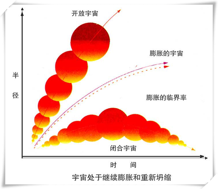 但是,如果万有引力超过膨胀力,那么宇宙就是封闭的,因而它将停止膨胀(也许在大爆后1万亿年左右),然后以更大的速度开始收缩。它将在大约2万亿年的时间范围内的大毁灭中坍缩到原来的样子。因此,封闭的宇宙在空间和时间上都是有限的。