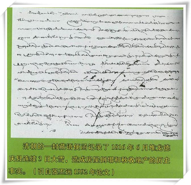 清政府曾在西藏设立地方官署噶厦,驻地在大昭寺,在噶厦给地方官员的一封便函中便记录了1816年6月堆龙德庆县一带连降三天三夜大雪的史实,这场雪灾造成了秋收绝产和大批房屋倒塌等严重灾情。可见,尽管有关青藏高原历史气候的文字记录较少,但仍然具有挖掘的潜力。