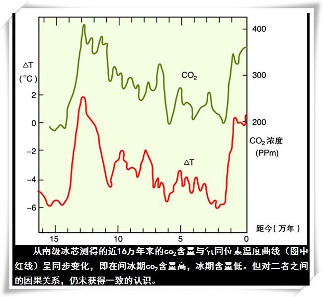 来自南极的资料表明,二氧化碳和温度在过去16万年间具很强的相关性。在这个地质时间里,自前工业化时代以来的二氧化碳和温度变化有一个显著的尖峰,这与由南极附近冰芯资料推出的缓慢的自然变化形成了对照。作用将是加速,而不是延缓。这里,科学的故事仍旧是不完美的。不管怎样,大多数科学家同意这样一种观点,即生物在晚近的冰川期和间冰川期、气候变化和温室气体之间的正反馈关系中,曾经是一种主要因素。