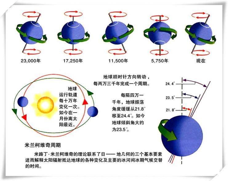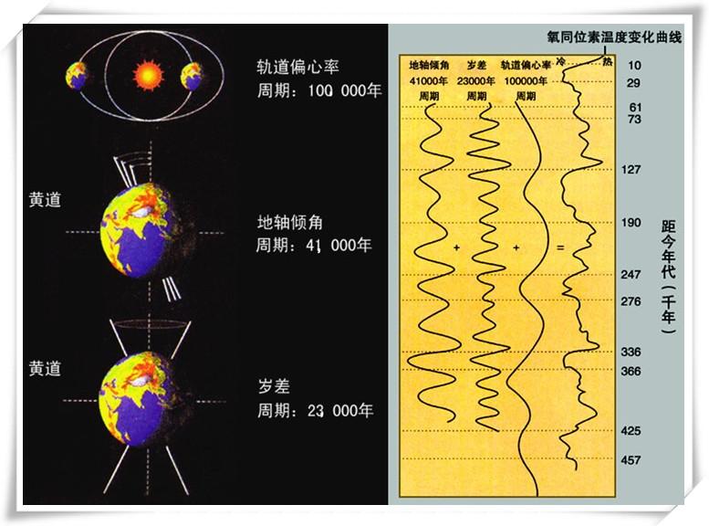 2.地球黄赤交角的周期变化导致气温的变化。黄赤交角指黄道与天赤道的交角,它的变化主要受行星摄动的影响。当黄赤交角大时,冬夏差别增大,年平均日射率最小,使低纬地区处于寒冷时期,有利于冰川生成。