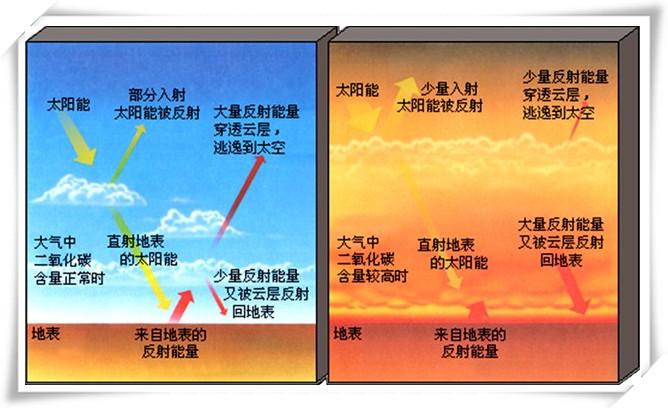 地球要保持恒定的温度,那么它向外的辐射必须同它吸收太阳的辐射大致平衡。大气中过多的二氧化碳将吸收一部分地表向外的辐射,最终导致地表温度升高。