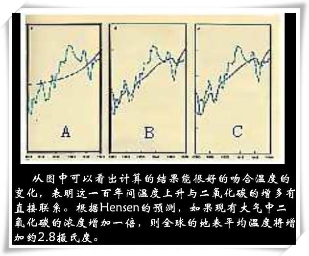 计算的结果能很好的吻合温度的变化,表明一百年间温度上升与二氧化碳的增多有直接联系。根据Hensen的预测,如果现有大气中二氧化碳的浓度增加一倍,则全球的地表平均温度将增加约2.8℃。
