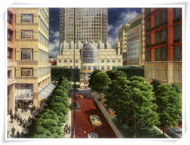 ②宏伟的街道和广场空间的最大距离不超过140m。当超过140m时,墙上的沟槽线角消失,透视感变得接近立面。这时巨大的广场和植有树木的狭长空间可以作为一个纪念性建筑的前景。