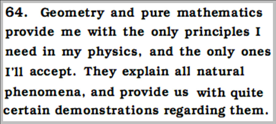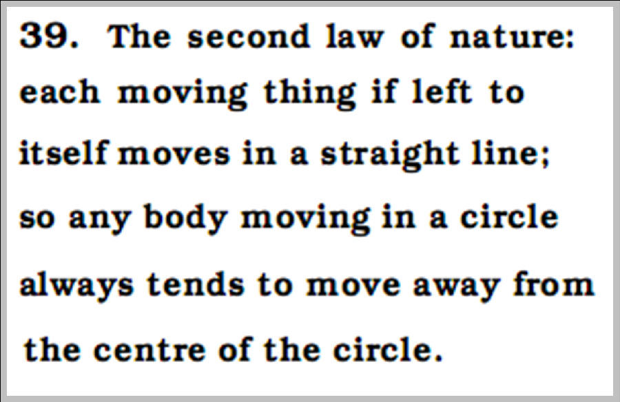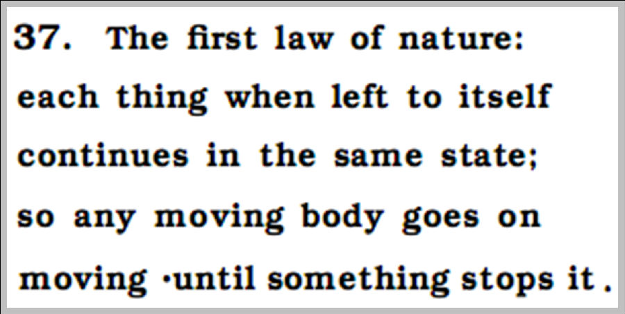 在物理学方面,笛卡儿也有所建树。力学上笛卡尔发展了伽利略运动相对性的理论,论证了惯性运动的直线性。笛卡尔发现了动量守恒原理的原始形式。笛卡尔还发展了宇宙演化论、漩涡说等理论学说,虽然具体理论有许多缺陷,但依然对以后的自然科学发展产生了显著的影响。这里我们指出由笛卡尔提出的牛顿第一定律:In在没有外力的情况,一个对象的议案将被统一,并在一条直线上。