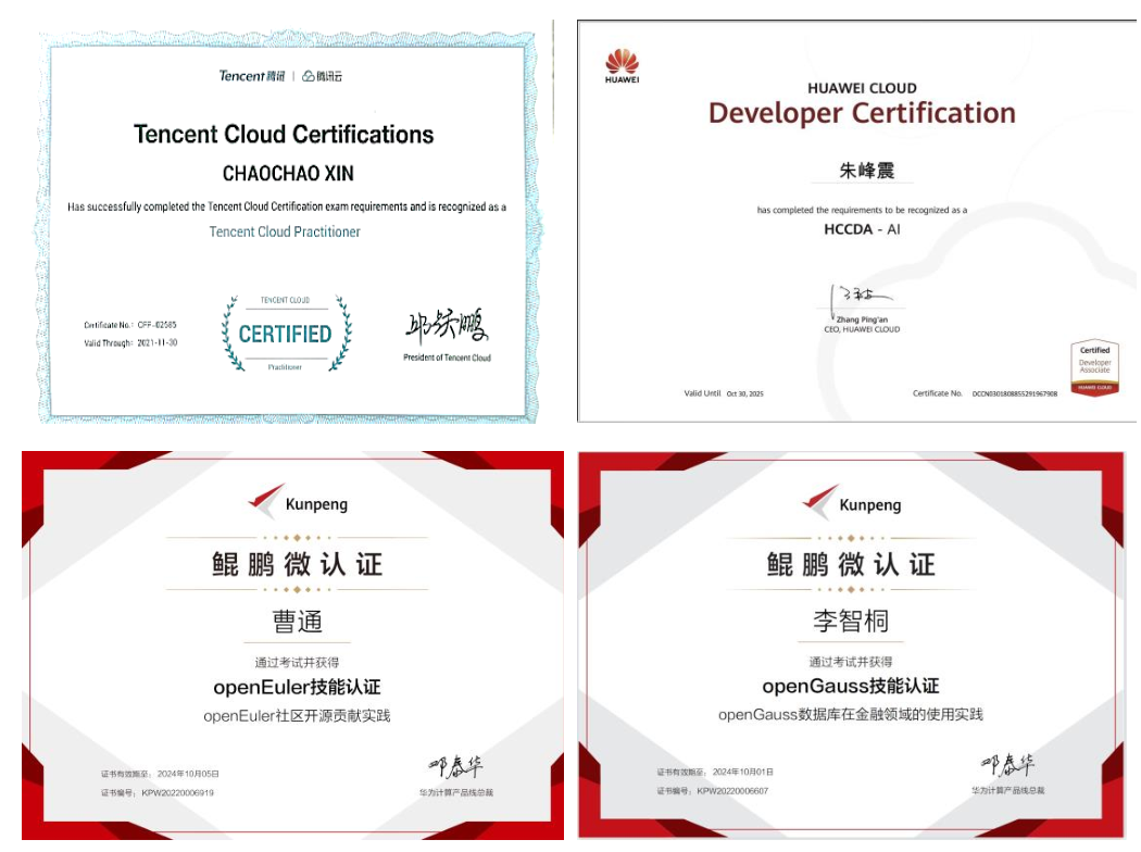 参加华为、腾讯的认证考试,主要包括腾讯公司的云从业者认证;华为技术有限公司的HCCDA - AI认证、openGauss技能认证、openEuler技能认证。