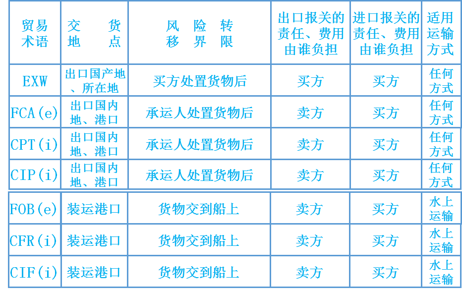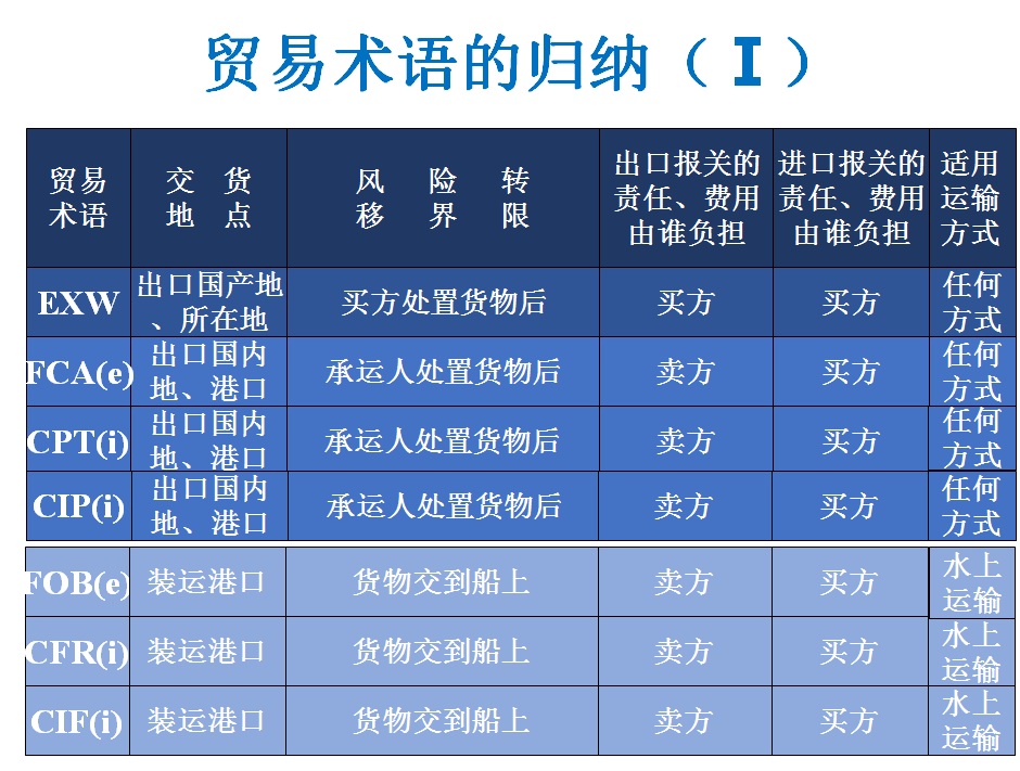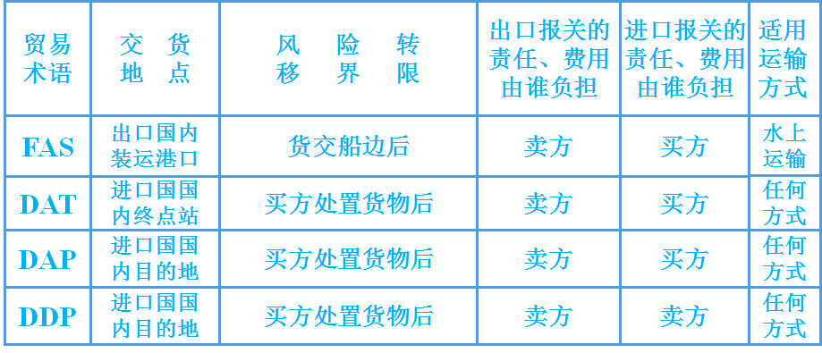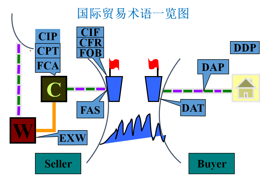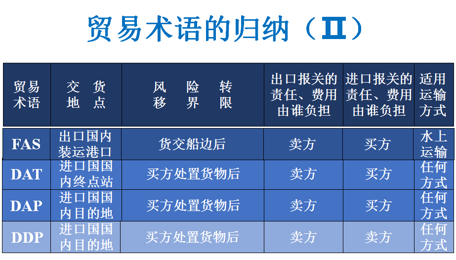 (1)货物的交接问题。在实践中有时采用“EXW装车”变形。 (2)EXW的适用范围。该术语在一些陆地接壤国家应用比较普遍。 (3)买方是否能够办理出关手续。FCA 海河运输 卖方:货交(码头或驳船)船边、出口清关 买方:装船、安排运输、购买保险、进口入关、支付货款 (1)船边交货和船货衔接问题。买卖双方负担的风险和费用均以船边为界划分。如果买方所派的船只不能靠岸,卖方要负责用驳船把货物运至船边,仍在船边交货,而买方承担装船的责任和费用。 (2)转口贸易:已如此交付的货物,买方处置下(比较FOB) (3)出口清关:卖方 (4)对FAS术语的不同解释。《2010通则》,FAS只适用于海运和内河运输。而《1941年美国对外贸易定义修订本》中FAS适用任何运输方式。因此同北美国家的交易中如使用FAS,应加上“Vessel”字样。 Delivered at Terminal (… named terminal at port or place of desitation)终点站交货(……指定目的地港或目的地终点站) 进口国目的地港口、目的地终点站(内的特定地点)——交通枢纽,卸下(区别FCA,在出口国目的地卖方不卸货) 卖方:卸下货、货交终点站(含运输、保险) 、出口清关 买方:装货、安排(剩余)运输、购买保险、进口入关、支付货款 (1)终点站交货地点。《2010通则》规定,终点站包括任何特定地方。 (2)卖方的义务和风险转移问题。《2010通则》规定,卖方只需在终点站将经出口清关的货物,从运输工具上卸下,并交与买方处置,即完成交货。 Delivered at Place(…named place of destination)目的地交货(……指定目的地) 进口国目的地(内的特定地点)——(从终点站运到)任意一个地点,待卸下(类似FCA,出口国目的地卖方不卸货) 卖方:货交目的地(含运输、保险)、出口清关 买方:卸下货、装货、安排(剩余)运输、购买保险、进口入关、支付货款 (1)目的地交货。在指定目的地,将到达的运输工具上待卸下的货物,交由买方处置,即完成交货。 (2)明确约定目的地 (3)卖方办理货物出口清关,但无义务办理货物进口清关。 (4)适用于一种或多种运输方式。 Delivered Duty Paid (…named place of destination)完税后交货(……指定目的地) 即进口商只要在进口国内指定的交货地点受领货物即可。一切进出口手续和费用(包括进出口的海关手续及费用)均由出口商负责。对进口商而言,类似在本国购买货物。 进口国目的地(内的特定地点) 卖方:负担最多义务。出口出关、货交目的地(含国际运输、保险) 、进口入关、卸货——最大义务 买方:装货、安排国内运输、购买国内保险、支付货款 (1)进口清关 (2)运输方式:一种或多种运输方式。 (3)妥善办理投保事项 (4)协商决定,增值税VAT未付 掌握每种贸易术语,以及比较不同种类的贸易术语之间的异同时,从以下几个方面: 卖方的交货地点(实际交货、象征性交货) 买卖双方风险划分的界限 适用的运输方式 主要责任的划分(指办理运输,保险,进出口手续以及单据) 主要费用的划分(指与上述责任相关的费用的分担) •比较贸易通则2010中11个贸易术语的异同