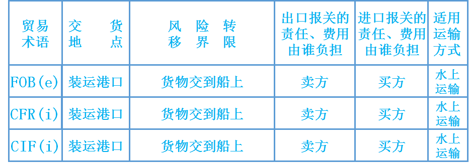 买方:装货、安排运输、购买保险、出口清关、进口入关、支付货款