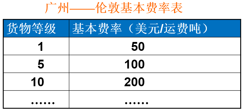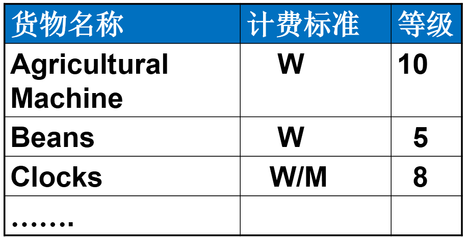 2.从运价本中的“货物分级表”(Classification of Commodities)查出水果汁为8级货,计算标准为M