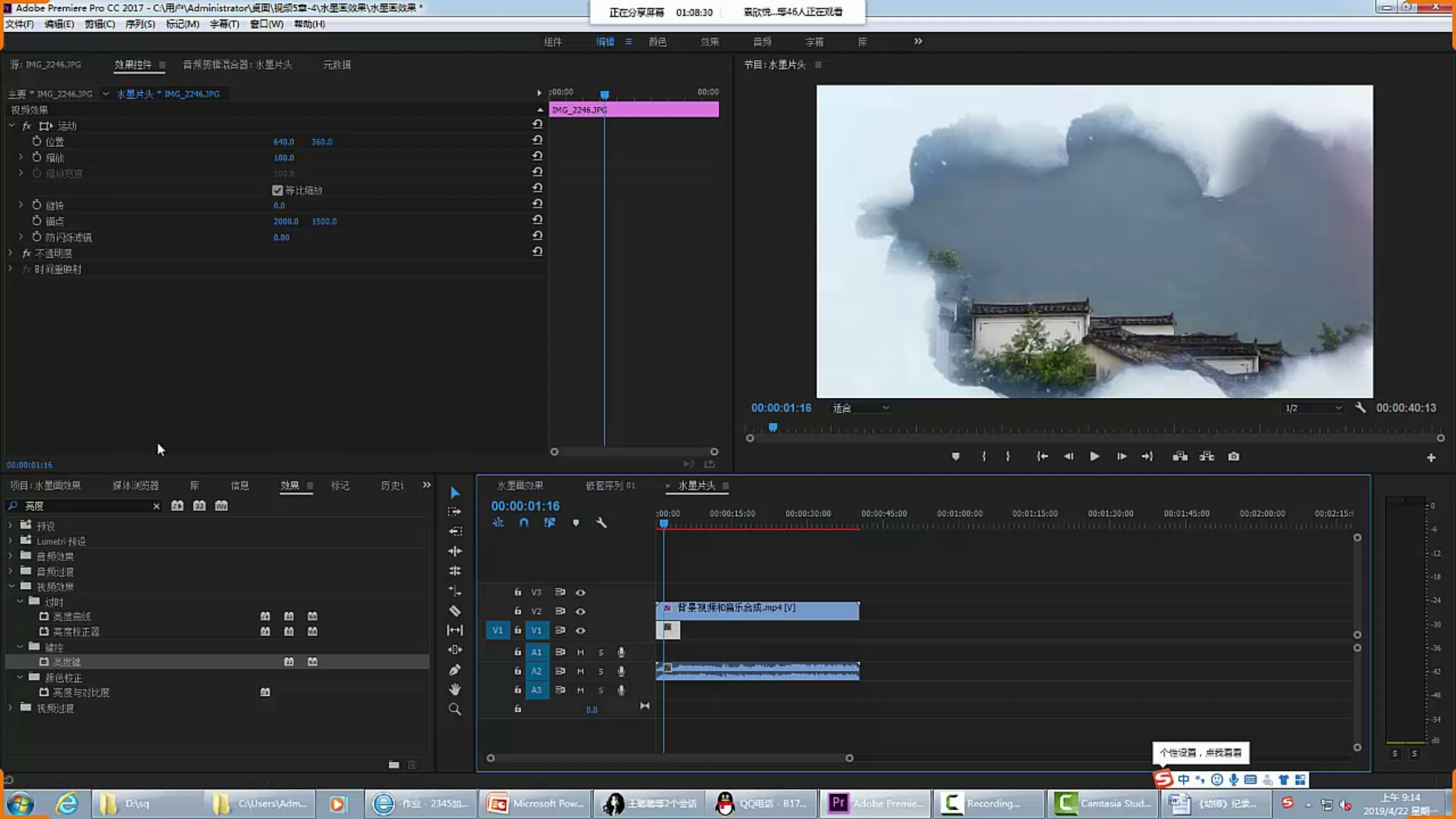 5、选择“亮度键”效果,将其放到背景视频上,作用是透出图片。