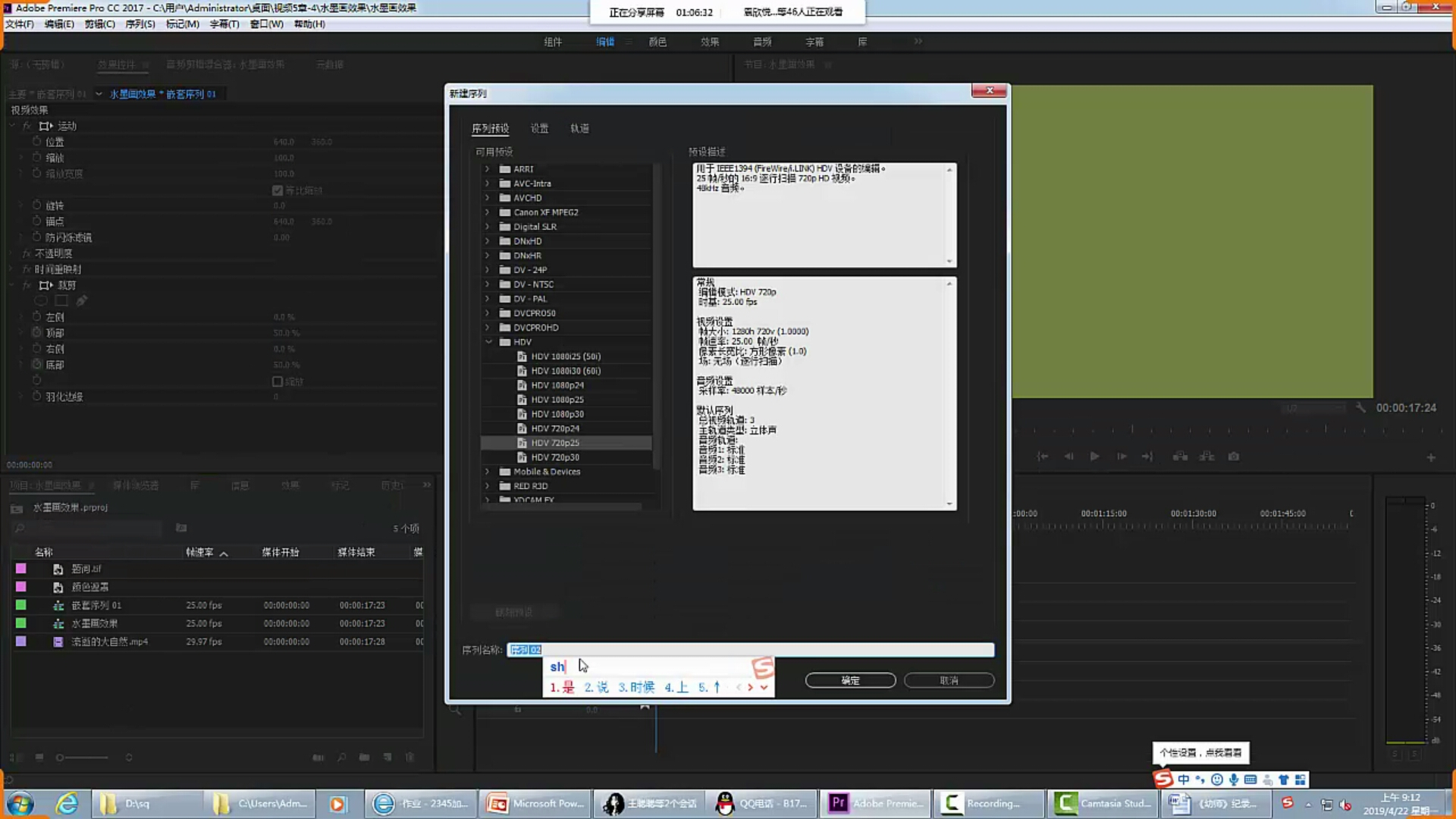 3、导入素材,并新建一个720*p25的序列,命名为“水墨画片头”。