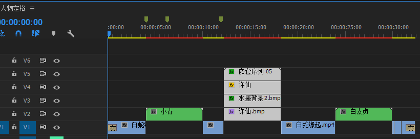 5.将上层的人物素材往上移动一个轨道,在两层人物之间添加水墨图片,若水墨图片不是透明背景,可添加颜色键将白色背景抠成透明的,然后再添加更改为颜色,将黑色墨迹调整为其他颜色。