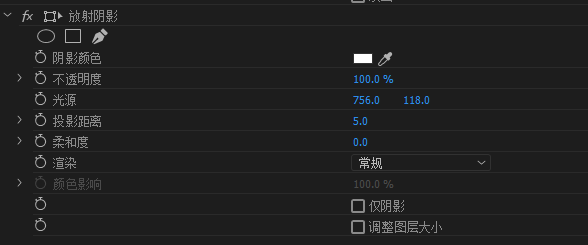 方法二,给嵌套序列添加放射阴影(径向阴影),调整阴影颜色为白色,不透明度为100%,调整光源和投影距离。此时还需将不透明度里的蒙版羽化调整为0。