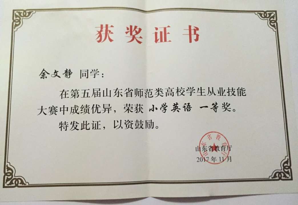 第五届山东省师范类高校学生从业技能大赛一等奖获得者 余文静
