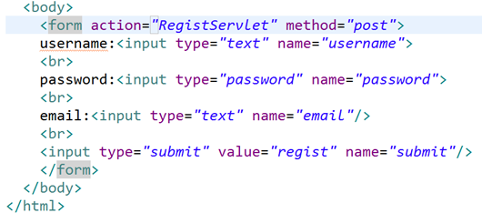 (3)设计视图register.jsp。设计一个表单,提供两个单行文本框和一个密码域供用户输入注册信息,并提交到RegisterServlet。