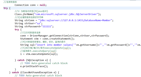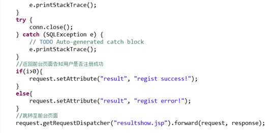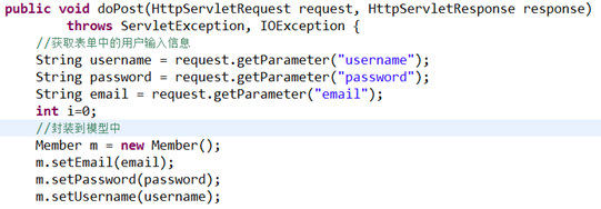 (5) 编写控制器RegisterServlet.java,重写doPost()方法,负责连接数据库,将用户提交的注册信息添加到member表,将数据存储到Member模型中,并将用户转发到resultshow.jsp页面查看注册反馈信息。