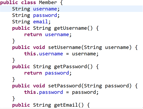 (2)开发模型Member.java,该模型提供成对的setXxx()和getXxx()方法用户设置和获取注册用户输入的用户名、密码、电子邮件及反馈信息。