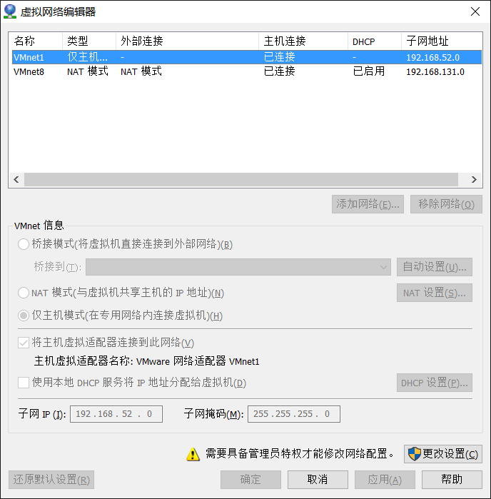 虚拟机的网络连接选择“仅主机模式”。