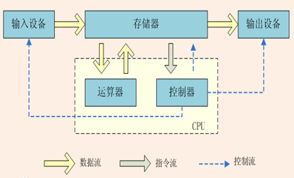 冯.诺依曼计算机具有运算器、控制器、存储器、输入设备和输出设备等五个基本功能部件,其体系结构如图1-2-2所示。