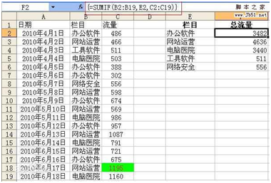 选中F2单元格,输入公式:=SUMIF(B2:B19,E2,C2:C19),输入公式完成后,直接按回车键,即可统计出办公软件栏目的总流量。
