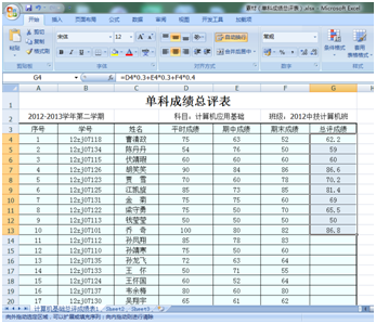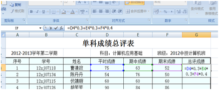 2、在“G4”单元格输入总评成绩的计算公式,确定。