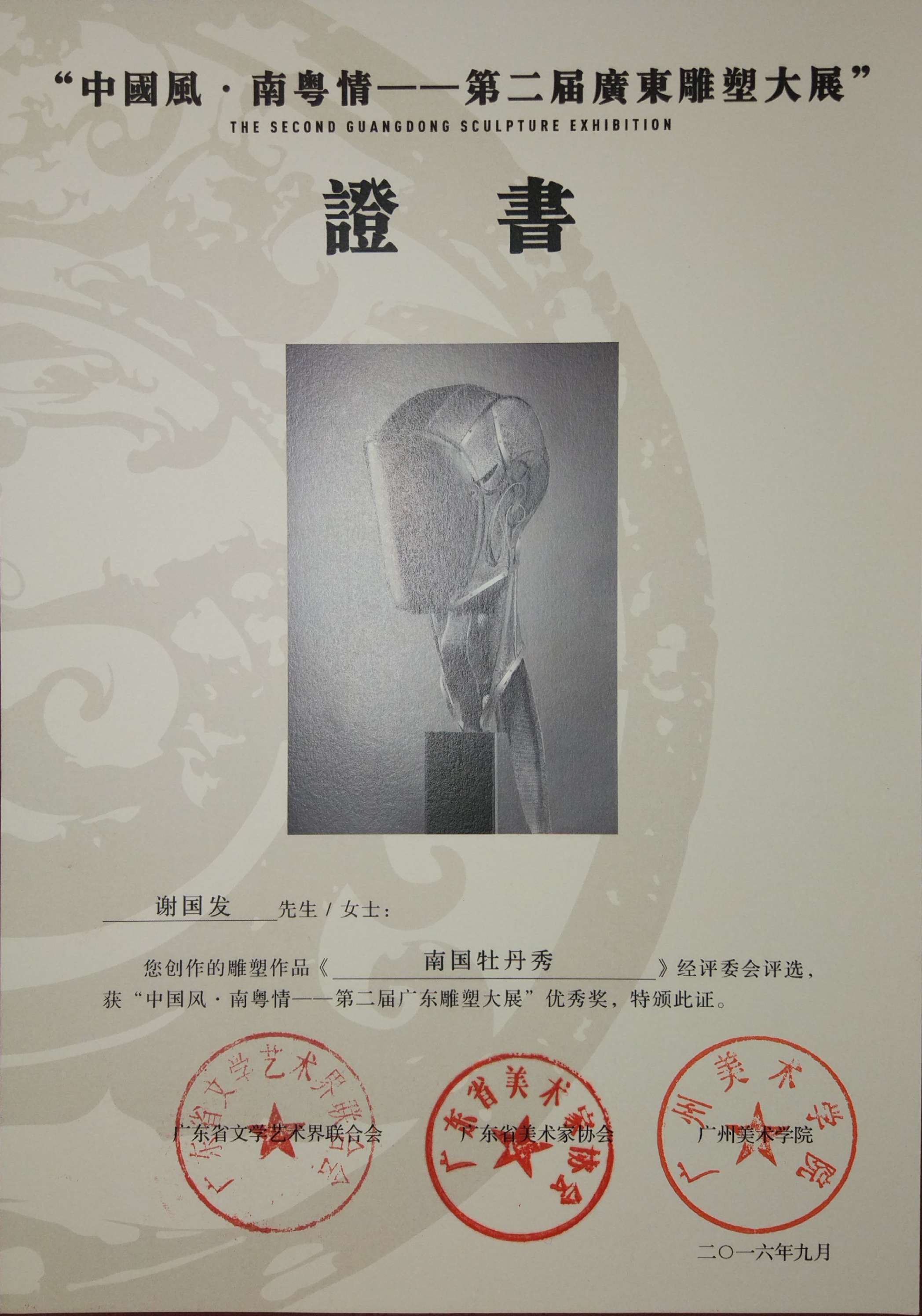 2016年《南国牡丹秀》获“中国风.南粤情——第二届广东雕塑大展”优秀奖