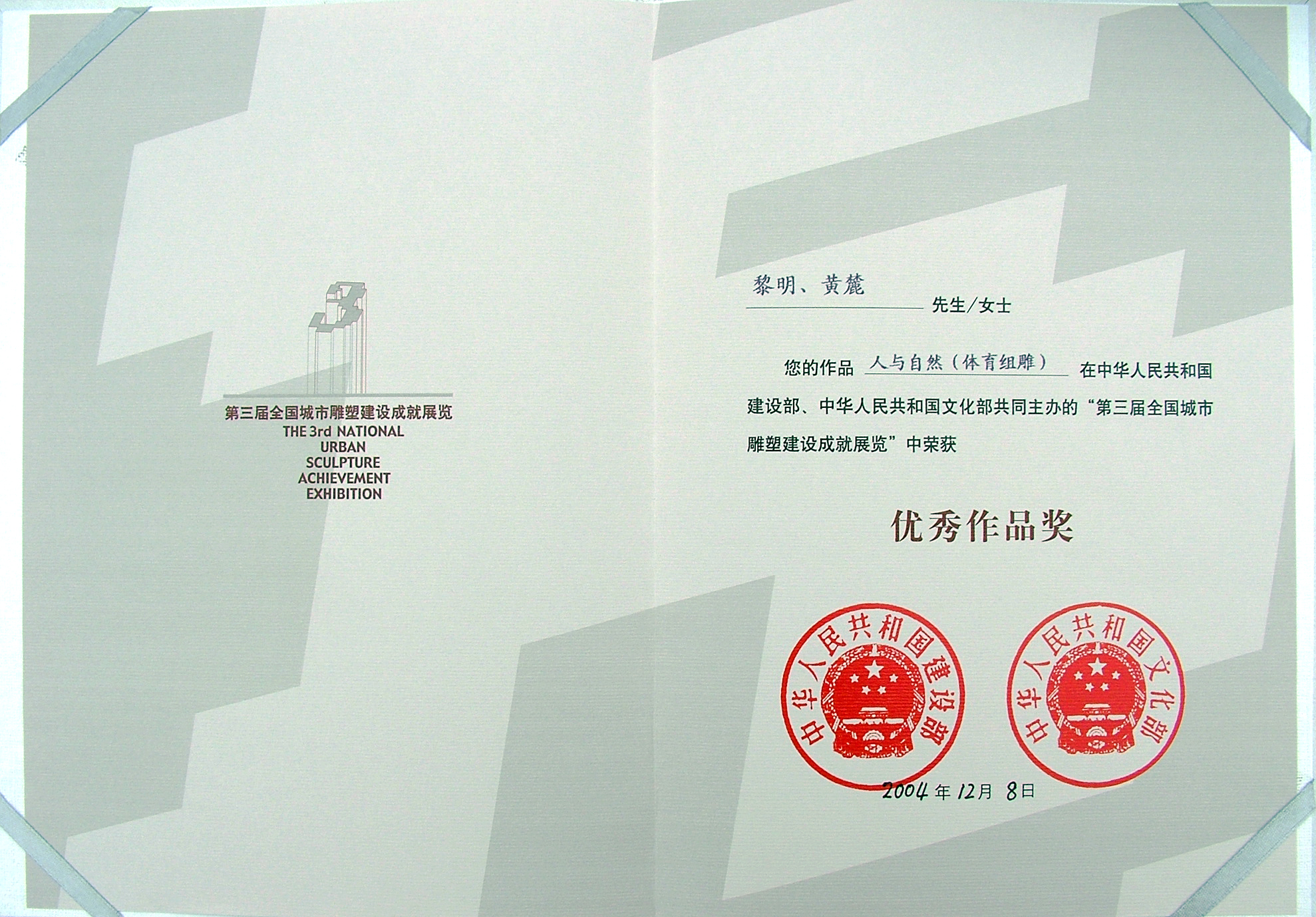2004 《人与自然》第三届全国城市雕塑建设成就展览优秀作品奖;