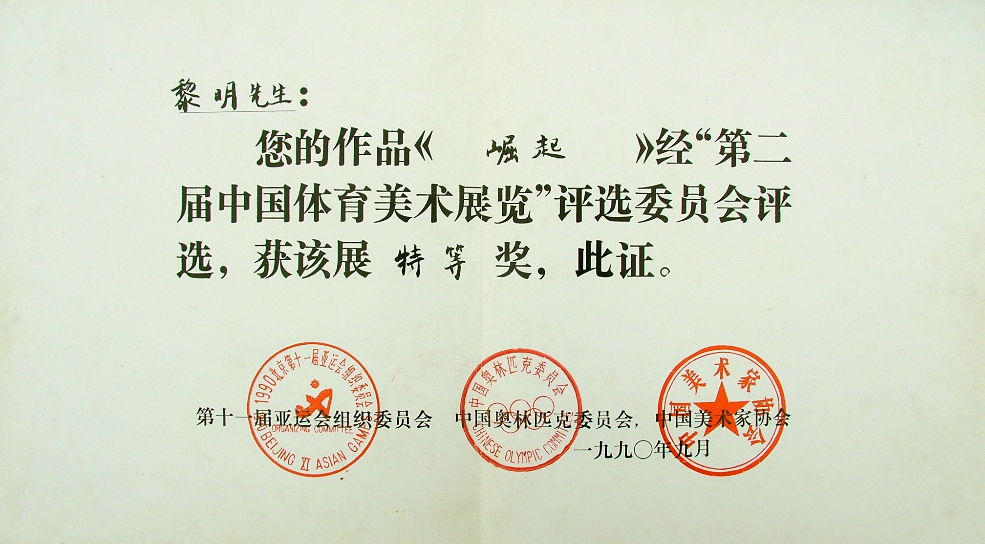 1990 《崛起》第二届中国体育美术展览特等奖;