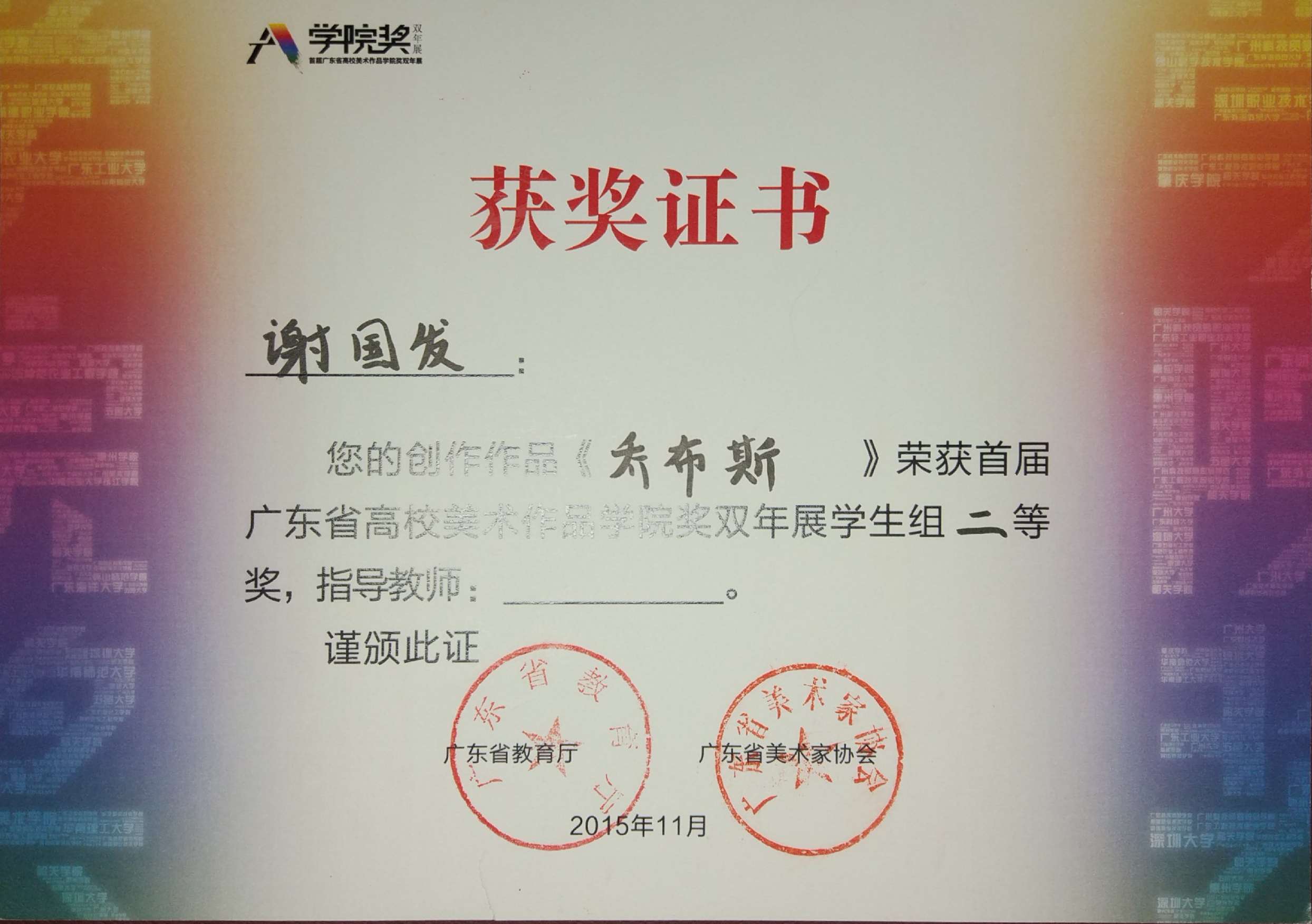 2015年《乔布斯》获首届广东省高校美术作品学院奖双年展二等奖。