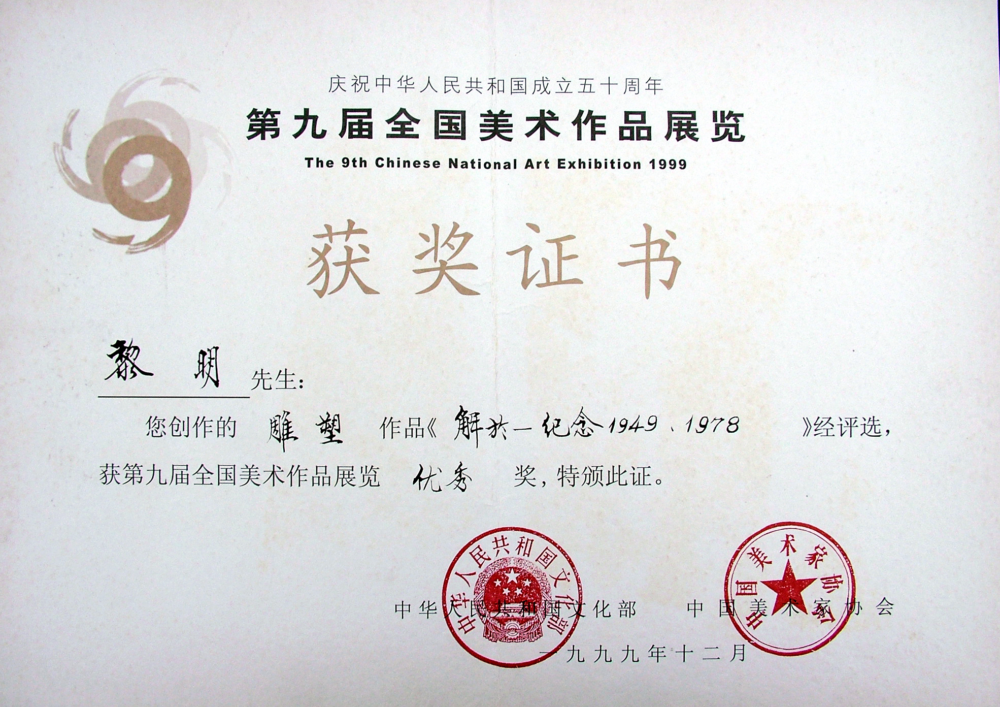 1999 《解放·纪念——1949.1978》第九届全国美术作品展览优秀作品奖;