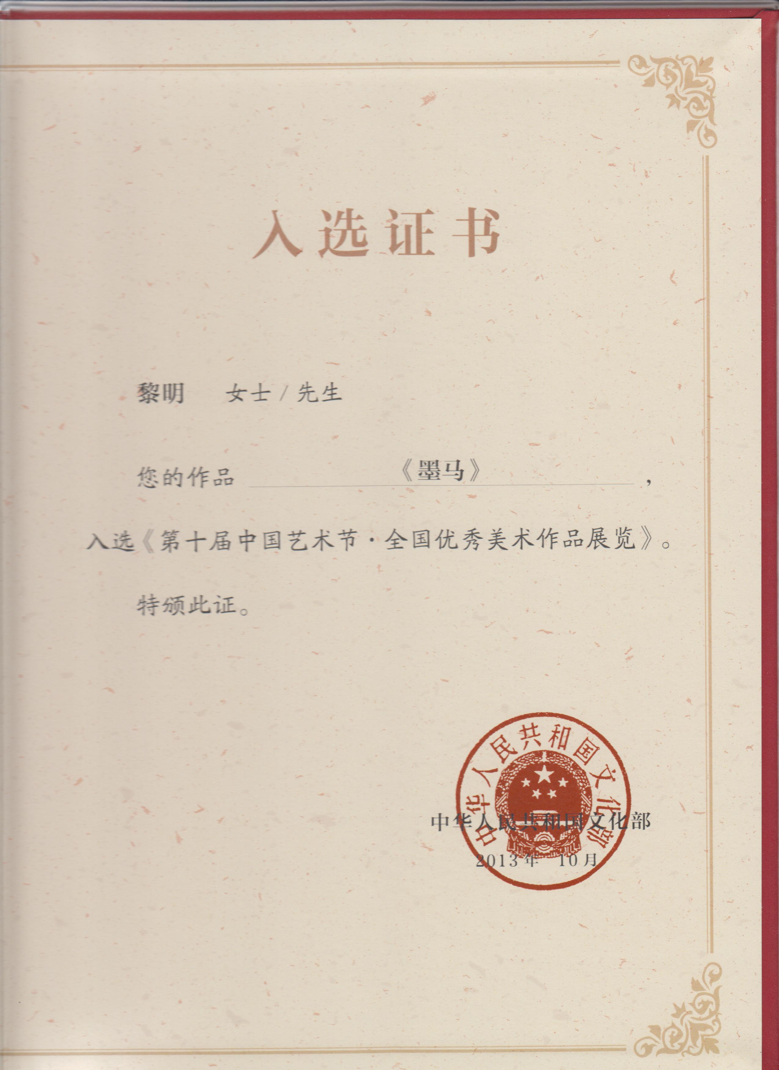 2013《墨马》获奖证书;