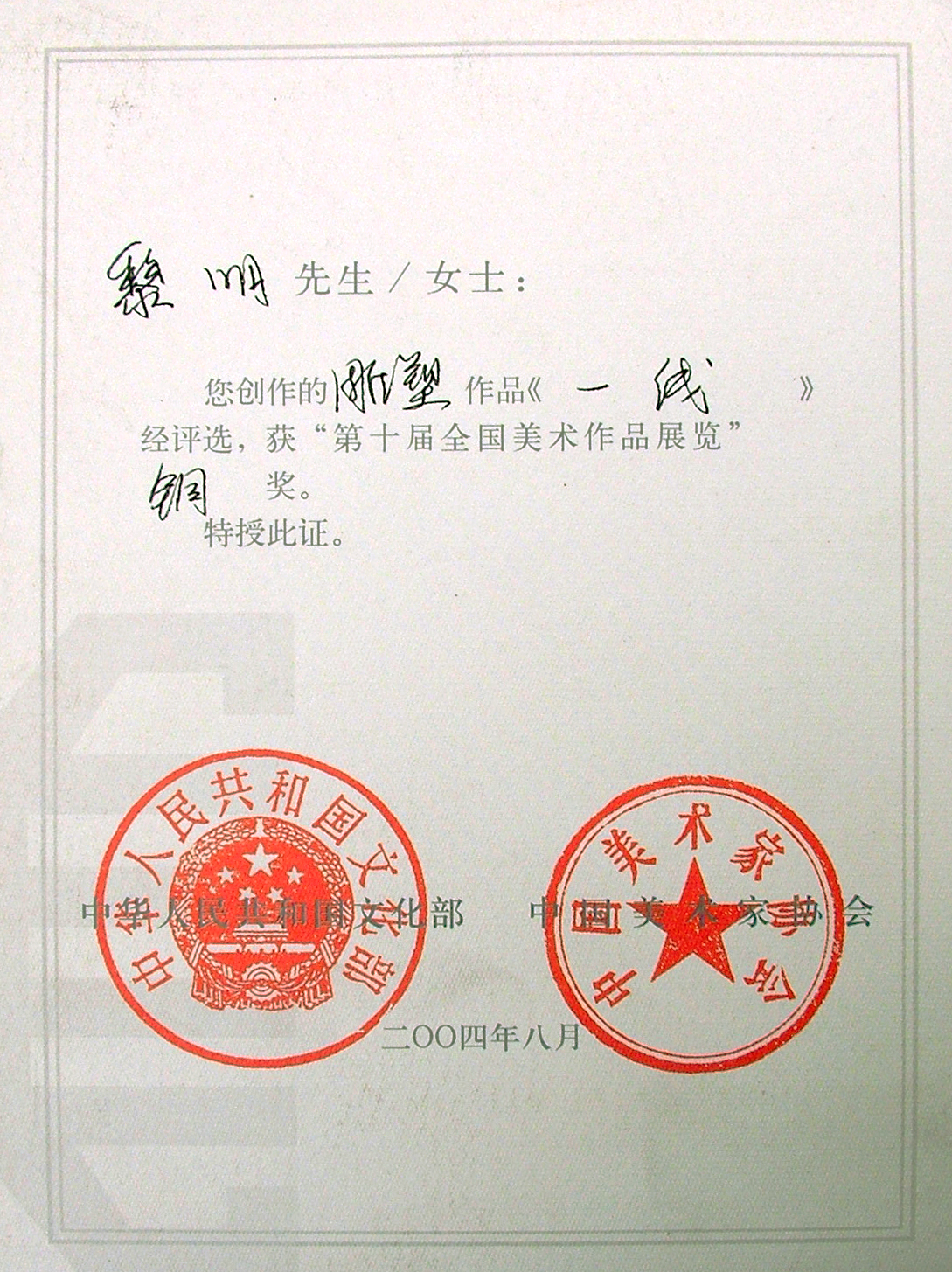 2004 《一线》第十届全国美术作品展览铜奖;