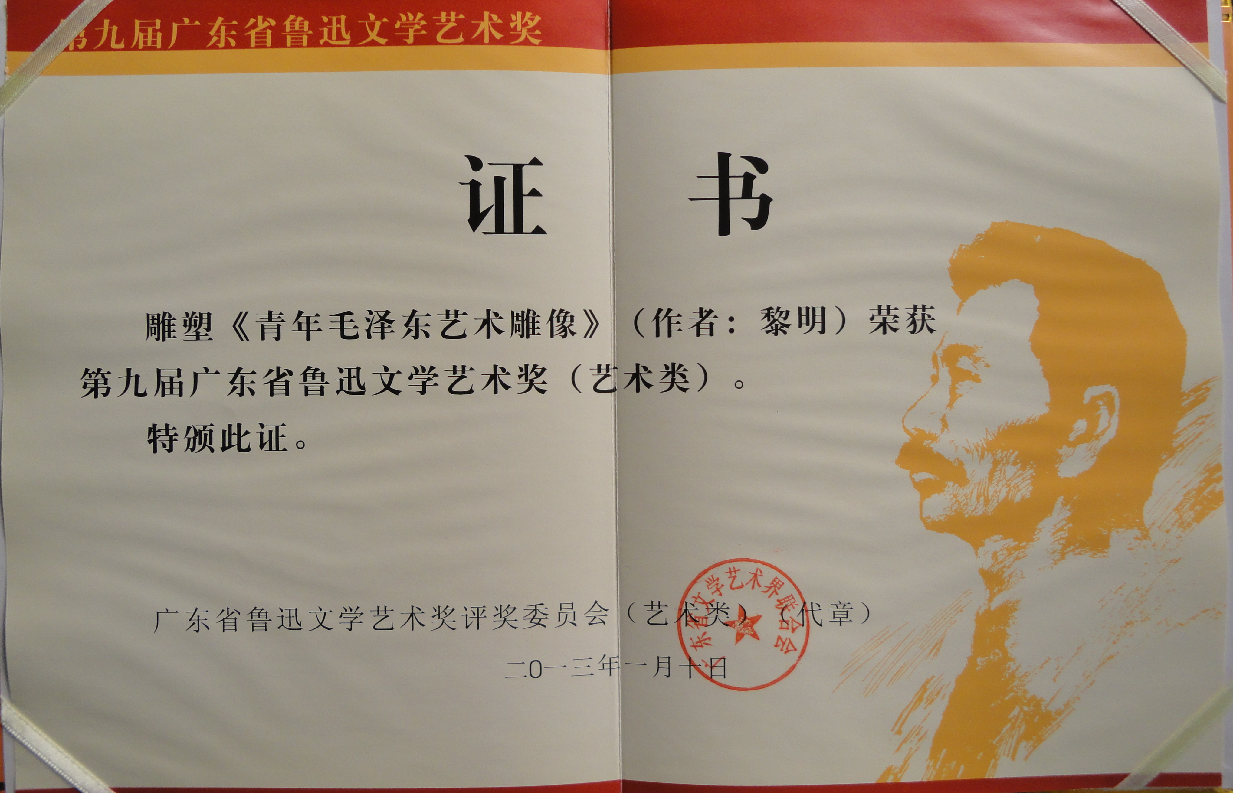 2013《青年毛泽东艺术雕像》第九届鲁迅文艺奖证书;