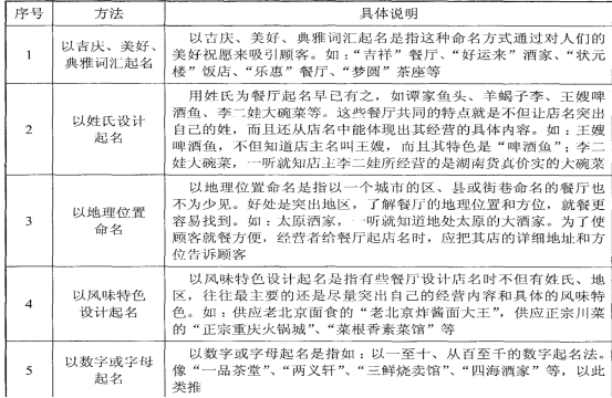 (1)注意餐厅的层次。明确开餐厅的规划、目标客源的层次之后,再确定自己餐厅的名字。 如果名字与规模不相符,不但高消费顾客会不屑一顾, 也会让普通顾客“望名却步”,使人无法信赖。比如, 一般的餐厅起名为么么大酒楼、么么大厦。还有些餐厅在起名时费尽了心思,总想与名牌餐厅混淆,采用移花接木以及音同字不同的手法起店名, 如“谭佳菜”与谭家菜,很容易惹上侵权嫌疑官司的。