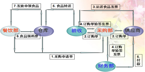 (五)送货分发。直拨原料—厨房或销售地点;入库原料—库房或贮藏室。