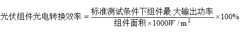 光伏组件光电转换效率是指标准测试条件下(AM1.5、组件温度25℃,辐照度1000W/m2)光伏组件最大输出功率与照射在该组件上的太阳光功率的比值。